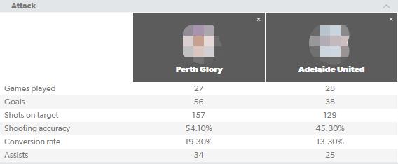 进攻对比中,珀斯明显高于阿德莱德。射门成功率和助攻数据上,体现的尤其明显。