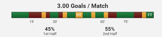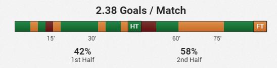 阿德莱德进球时间段除了上半场16-30分钟没有取得进球外,其余时间都有进球记录。比赛进行到61-75分钟后,阿德莱德的进攻能力一般,在这个时间段产生进球效率偏低。